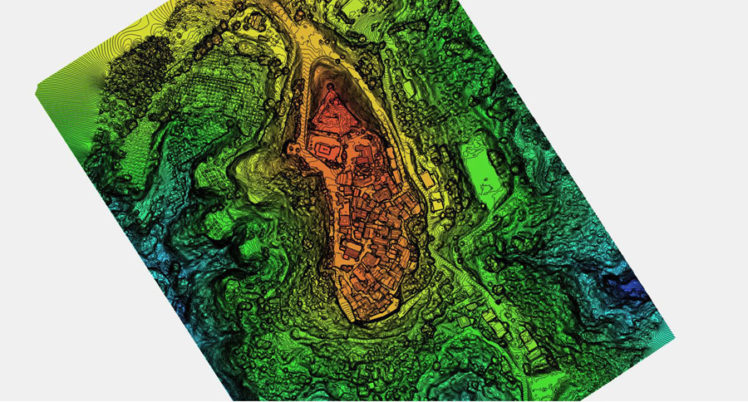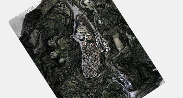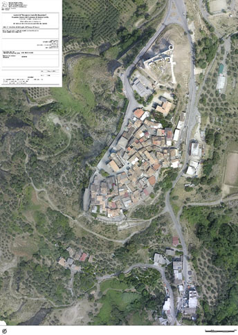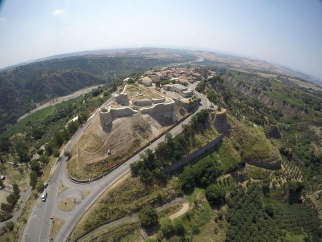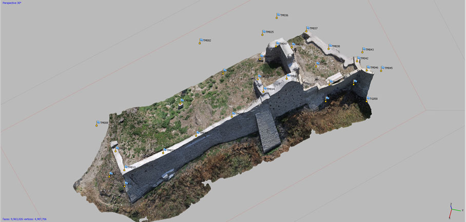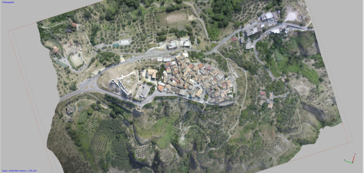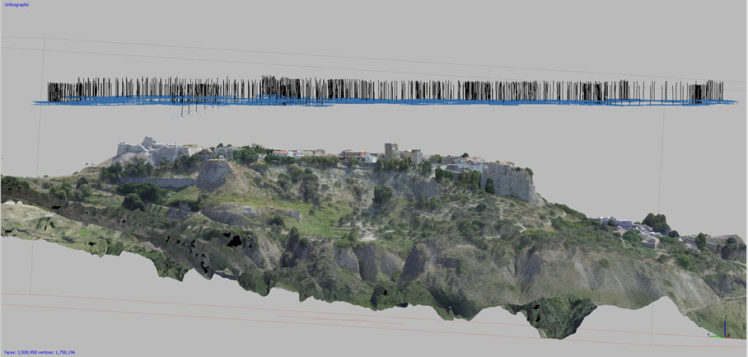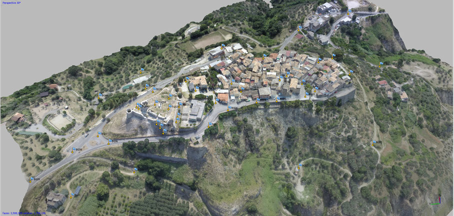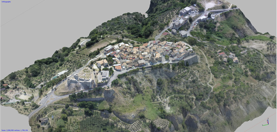 Nell’ambito dello stesso intervento la committenza ha richiesto di inquadrare con un rilievo 3D di portata più ampia il castello bizantino nel borgo di impianto medievale che domina l’altura. E’ stato pertanto realizzato un rilievo integrativo in scala 1:500, ricavato dalla elaborazione di circa 900 fotogrammi e di 45 punti di controllo a terra non materializzati, ma ricavati da elementi preesistenti riconoscibili sul terreno. Anche in questo caso è stato ricavato un modello di alto dettaglio del borgo e dell’altura fino alle pendici, da cui sono stati ricavati elaborati grafici bidimensionali quali ortofoto di dettaglio, curve di livello a passo 50 cm e modello digitale di altimetria.