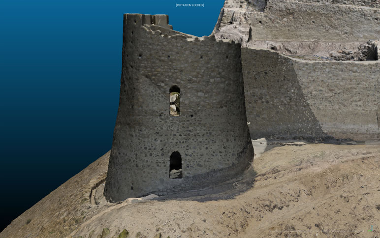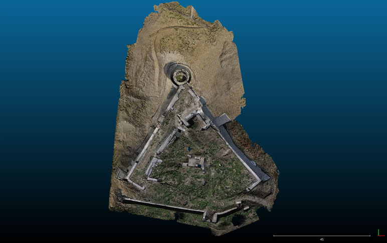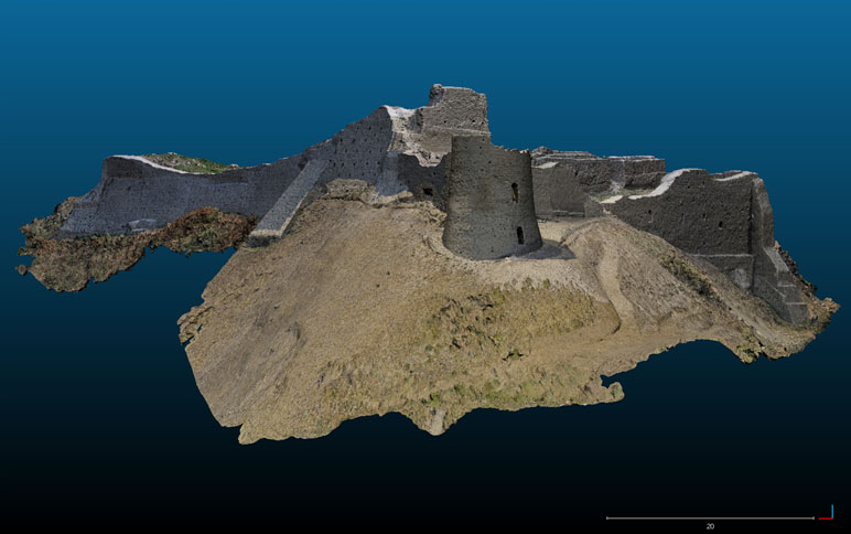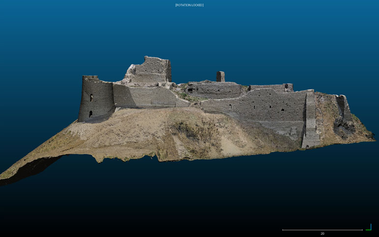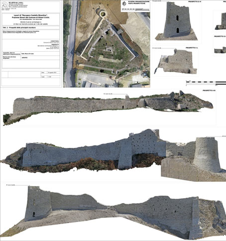 Per affrontare un impegno del genere, si è deciso di utilizzare il drone per tutte le riprese fotogrammetriche, con l’usilio di una fitta rete di punti di controllo misurati mediante stazione totale e GPS differenziale. E’ stato realizzato un modello 3D di alto dettaglio dell’intero castello, dalla fusione di 6 blocchi di rilievo di singole aree del monumento, utilizzando per le elaborazioni un totale di circa 900 scatti fotografici. Il rilievo da drone una volta riassemblato, grazie ad una serie di viste oblique e quasi frontali è riuscito a documentare in dettaglio anche le murature a sviluppo verticale. Inoltre, essendo il castello collocato su un’altura con alcuni versanti inaccessibili, l’utilizzo del drone non avrebbe avuto realistiche alternative perseguibili. Il modello 3D è servito anche come base per la progettazione della fruizione e della valorizzazione del monumento e si è rivelato uno strumento prezioso per progettazioni specifiche nell’ambito della attività di restauro in corso, come impianto di illuminazione, regimentazione delle acque meteoriche, ecc.. Dal modello 3D sono stati ricavati gli elaborati grafici bidimensionali, planimetrie, prospetti e sezioni, richiesti per la documentazione esaustiva del monumento.
