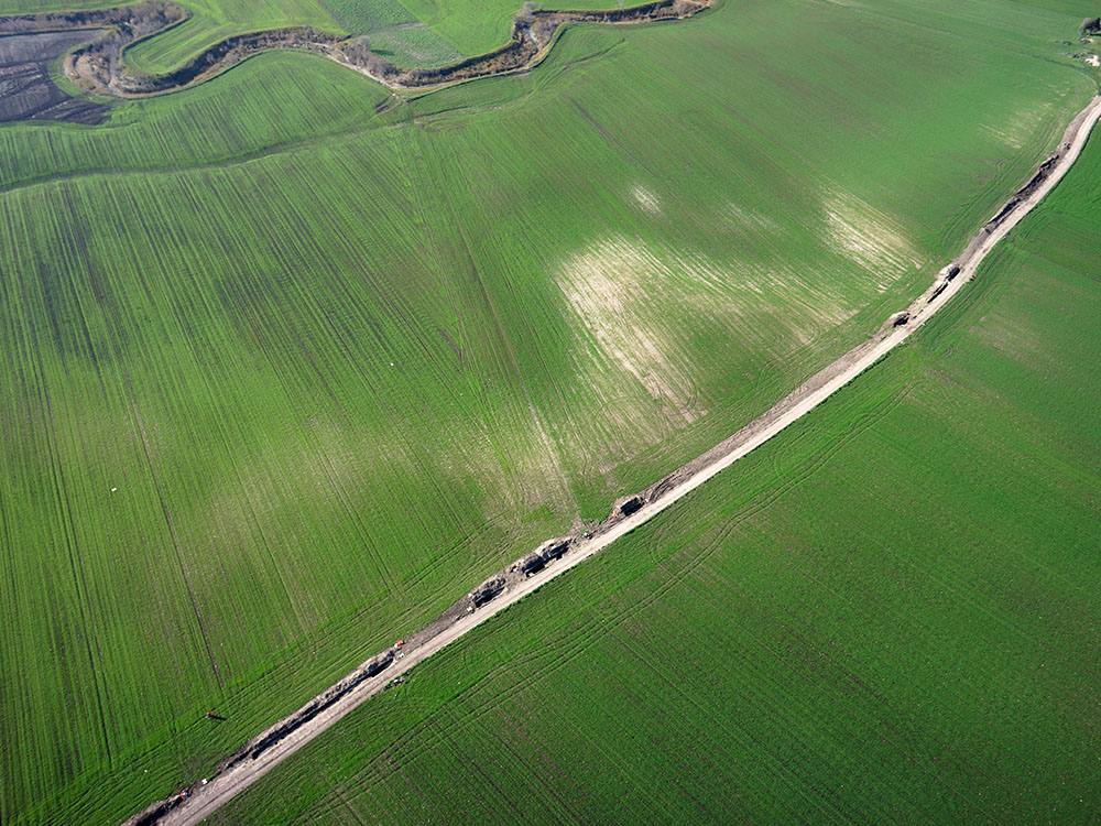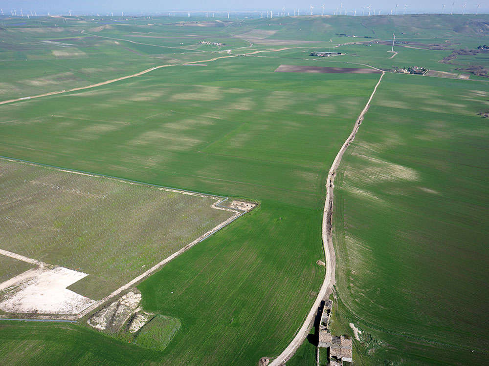 Descrizione: Riprese aeree di coppie fotogrammetriche finalizzate al rilievo archeologico nell’ambito del cantiere di scavo per il parco eolico di Troia (FG).